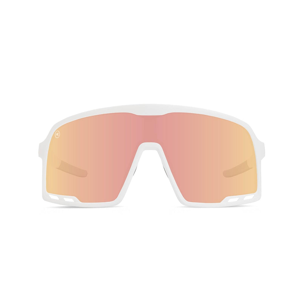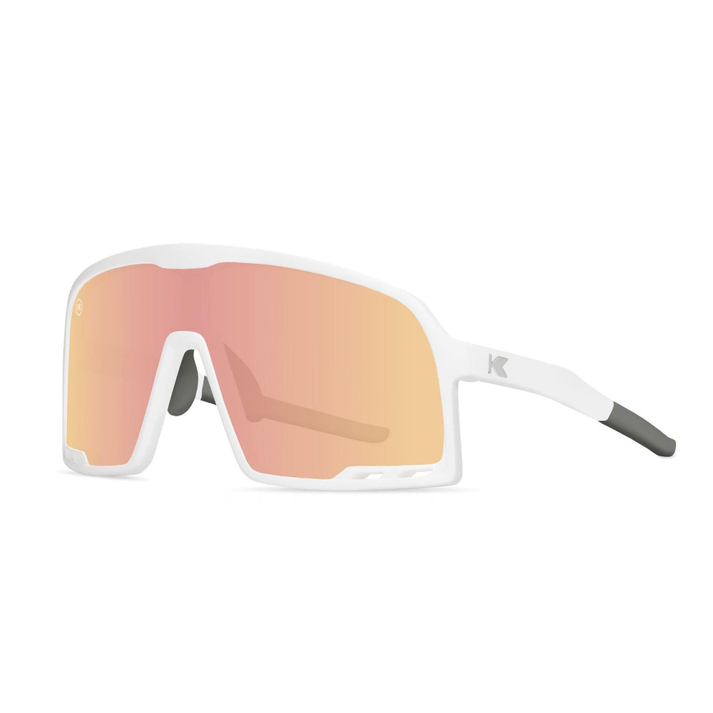 Catch everyone’s eye with a pair of wraparound Starlight Campeones! The one-piece, rose gold lens features Knockterra technology so that water and oil smudges are only a distant memory. Bright chrome ‘K’ logos accent rubberized gray ear & nose grips for an extra sturdy pair of performance sunglasses. The whole package is brought together with a crisp white rubberized frame. Now who’s ready to steal the show?