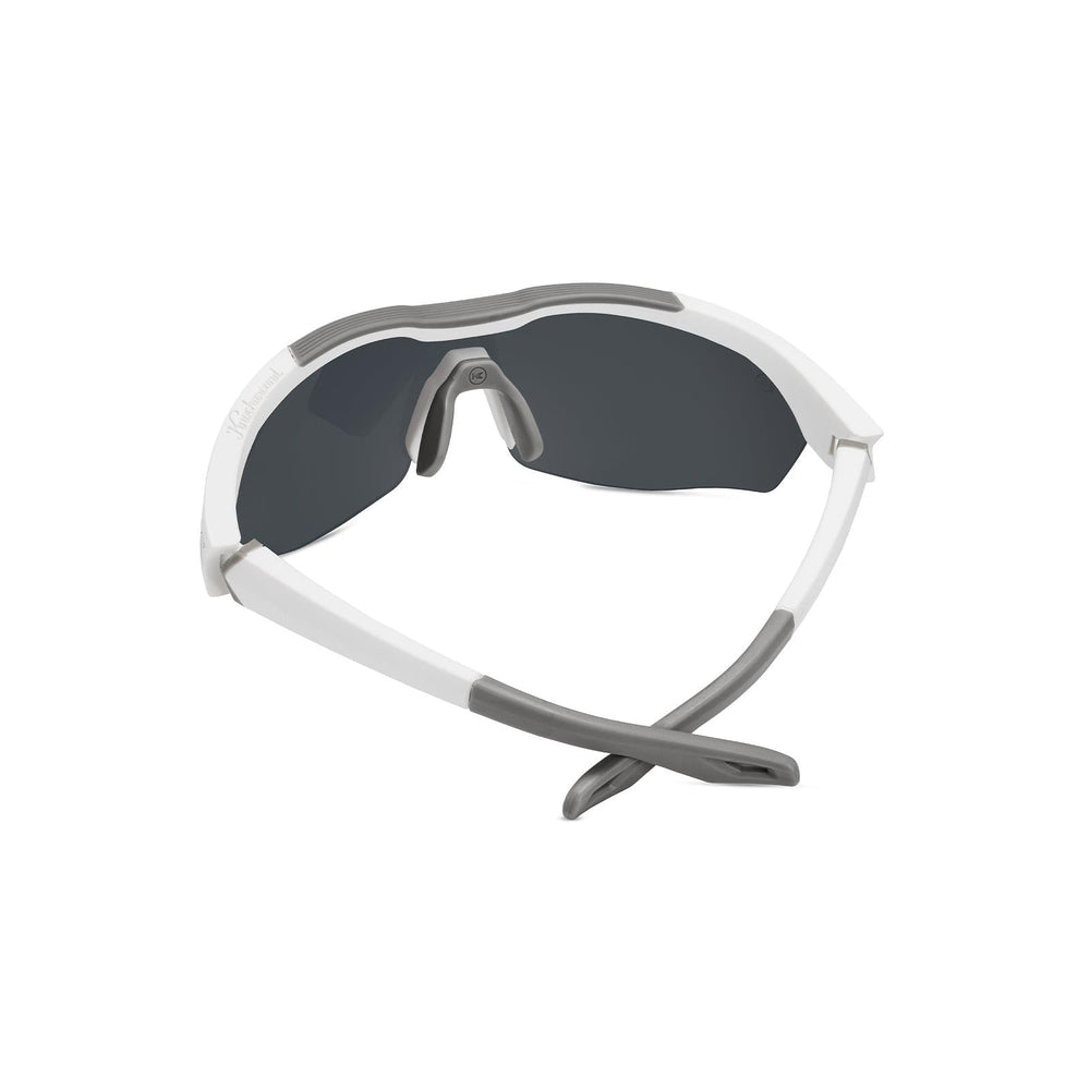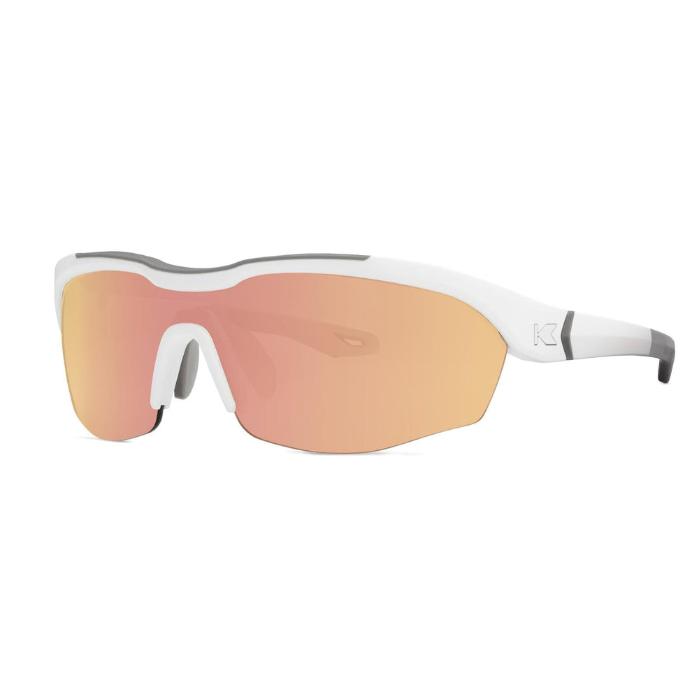 Fashion forward and ready to shine, our Starlight Kinetics wrapping sunglasses do the absolute most for your style game. The white rubberized frame features rubberized grey accents throughout for extra durability, while slick chrome ‘K’ detailing shows everyone where to snag a pair. Top it all off with our Knockterra rose gold lenses that feature UV400 protection plus resistance to water and oil. You’re all set for your close-up!