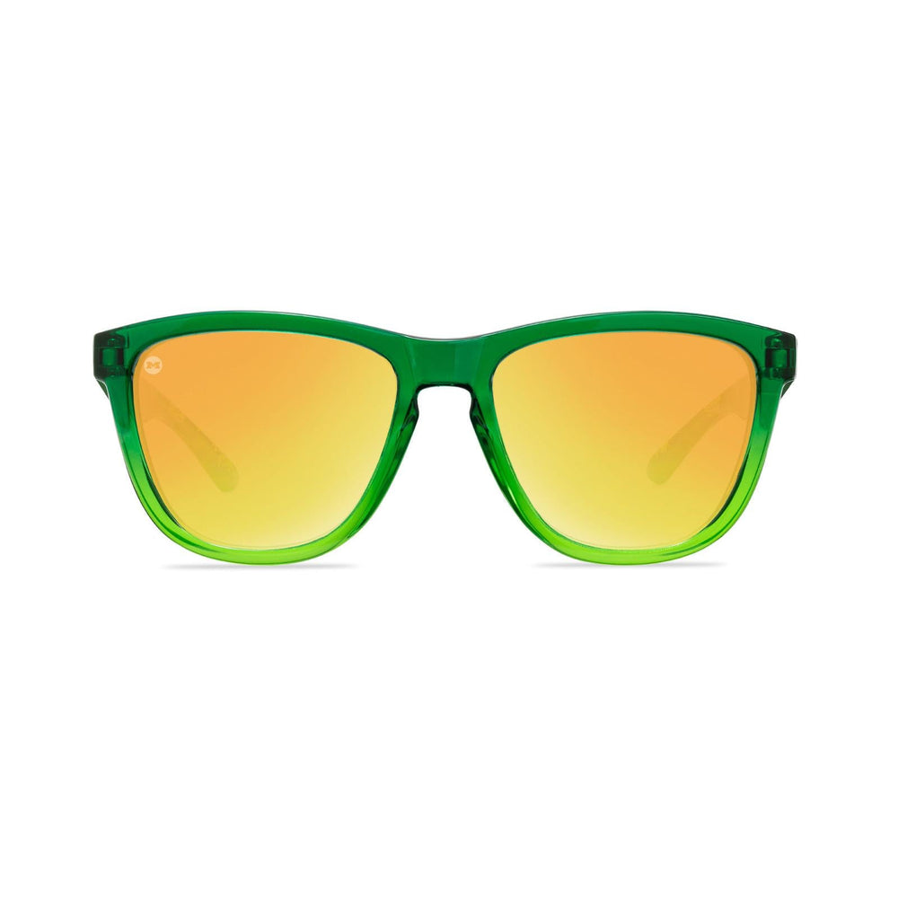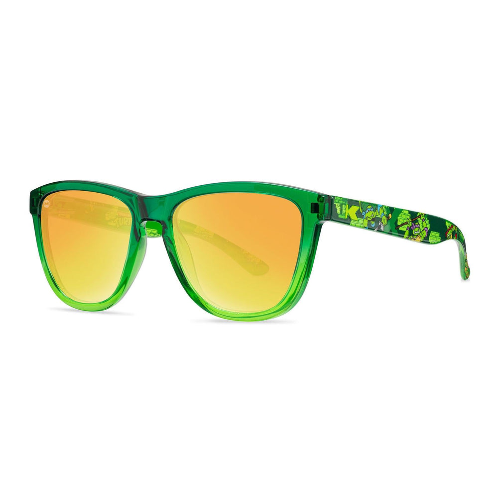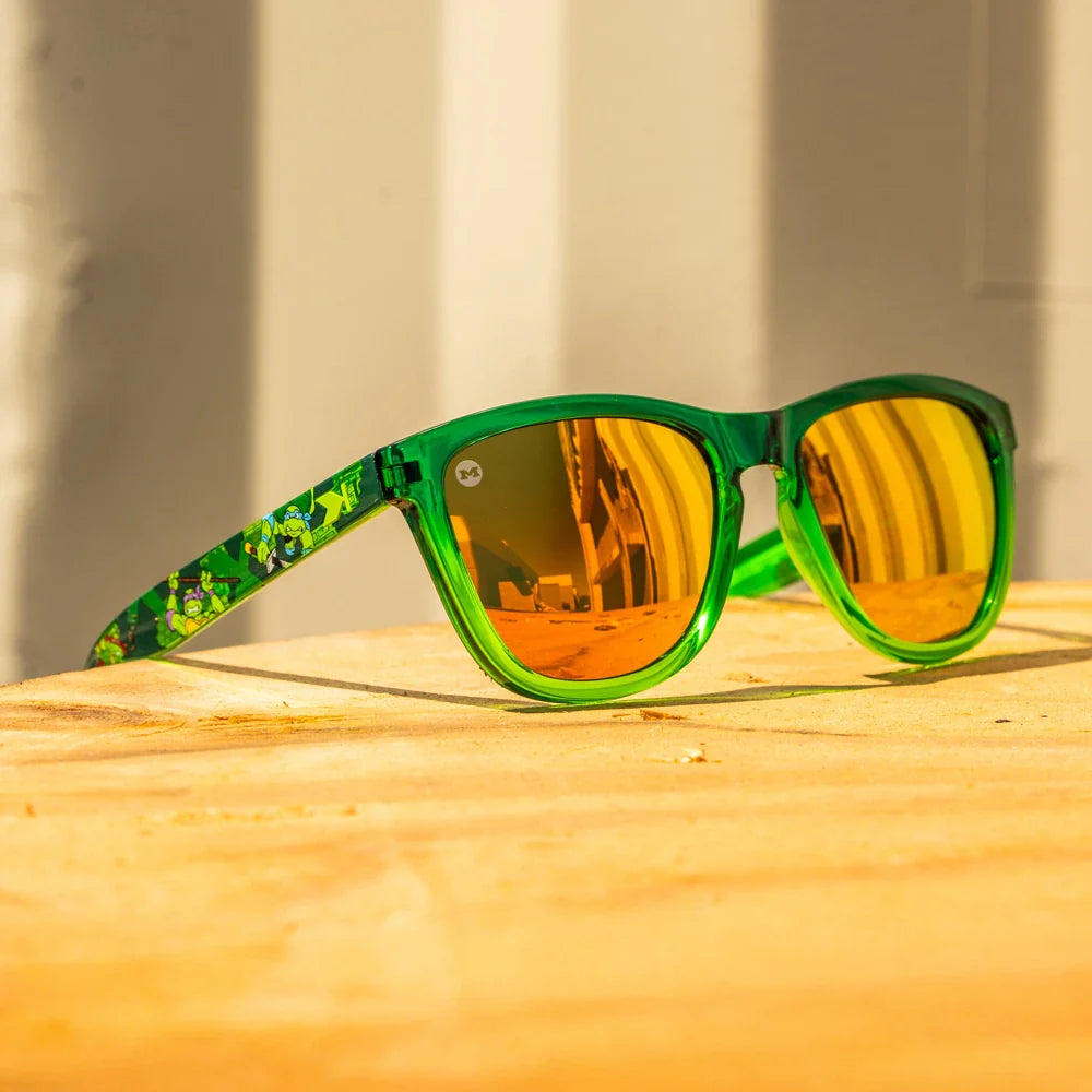 Inspired by the fearless antics of the Teenage Mutant Ninja Turtles and designed on our Premiums frame style, these sunglasses are as bold and exciting as a slice of pepperoni pizza after a sewer skate session. With vibrant semi-transparent green frames that scream "Cowabunga!" and arms that flaunt classic comic strip scenes, these shades aren't just sunglasses—they're a portal to adventure. Polarized orange lenses, bursting with Michelangelo’s fun-loving energy, block any city-sun glare, while detailed graphics bring the party dude straight into your style-sidekick arsenal. “radioactive” green K logos and the iconic TMNT logo on the inside of the arm round out this shell-shockingly cool pair of shades.
