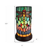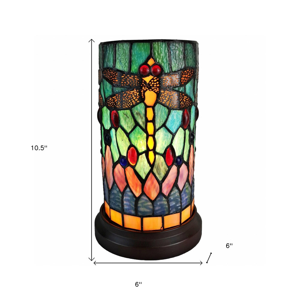 Add some warm light and classic beauty to your space with this 10.5" dragonfly stained glass accent table lamp. Hand-crafted with the same techniques used by the original Tiffany lamp makers, the multi-colored pieces of glass for this cylindrical piece are fused together to create a lamp that is also a colorful piece of art. Glass is hand cut to the perfect shape and size, wrapped in copper foil, and soldered together to create this stained glass beauty. Sitting atop a round resin base, this mini lamp is ideal for end table, desk, nightstand, or mantle. 10.5-inch H x 5-inch W x 5-inch D