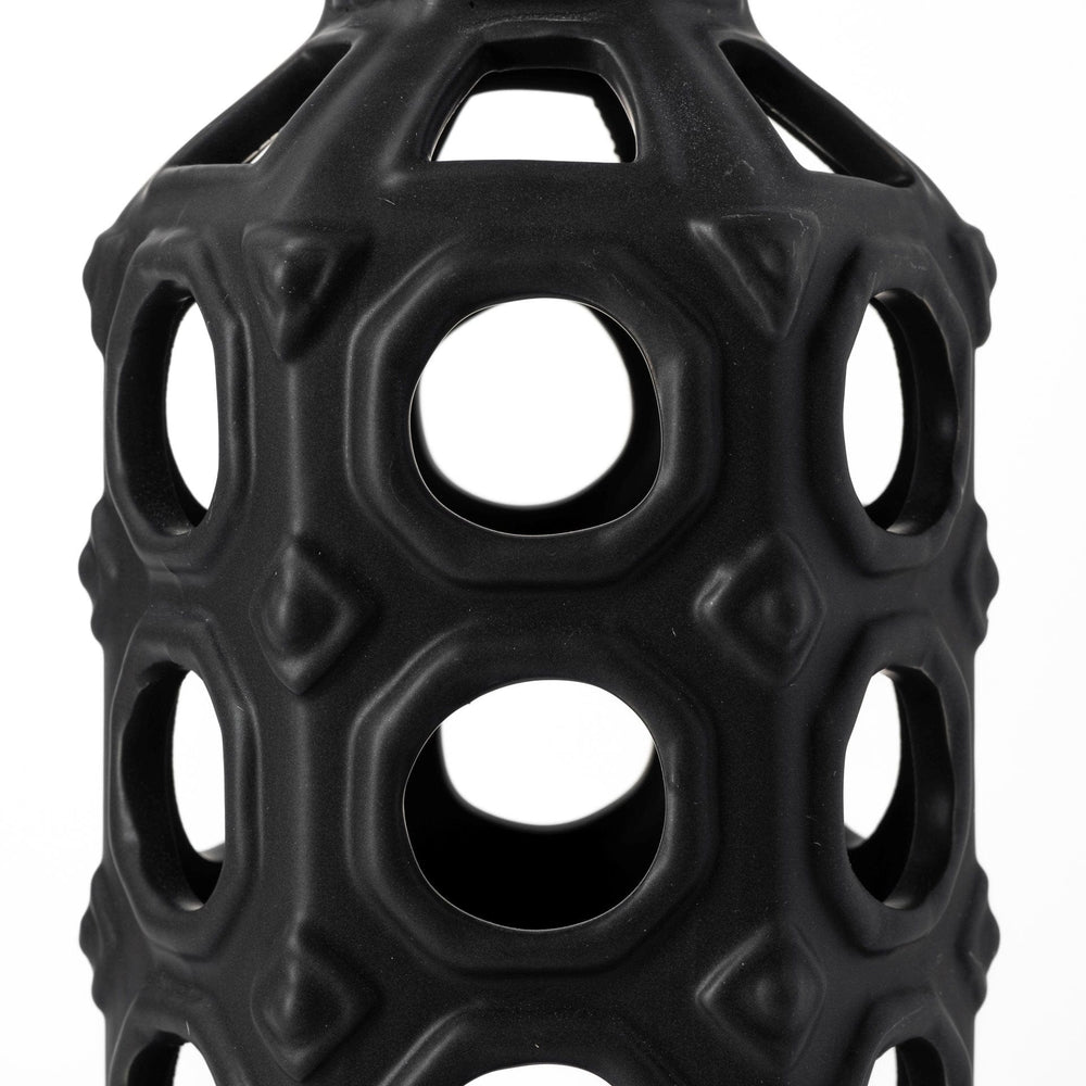This 12-inch black ceramic abstract cylinder table vase is a stunning centerpiece for any modern decor. This vase is made from ceramic and has a stunning semi-matte black finish on it. The base of the vase has a narrow domed shape with circular cut-outs. These circles shapes get smaller as they move up the body of the vase. There are small diamond geometric details in between these shapes and vertical rectangular shapes towards the top that add to the unique design. 12-inch H x 4-inch W x 4-inch D