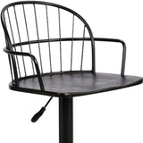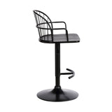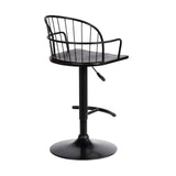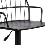 If you've always wanted a stylish bar seating in your home with enough functionality and design, this Black Wood and Metal Adjustable Curve Back Bar Stool is an excellent choice to consider. The stool is constructed from beautiful black metal with a black wooden seat that gives it a combination of rustic with a hint of modern industrial. The curved back has metal rods going across the back giving it an open and airy feel and then extends to the perfect height arm rests on either side. Simple yet functional, this all black bar stool also features a foot bar for convenient foot and leg support. 42.5" x 18" x 20"
