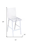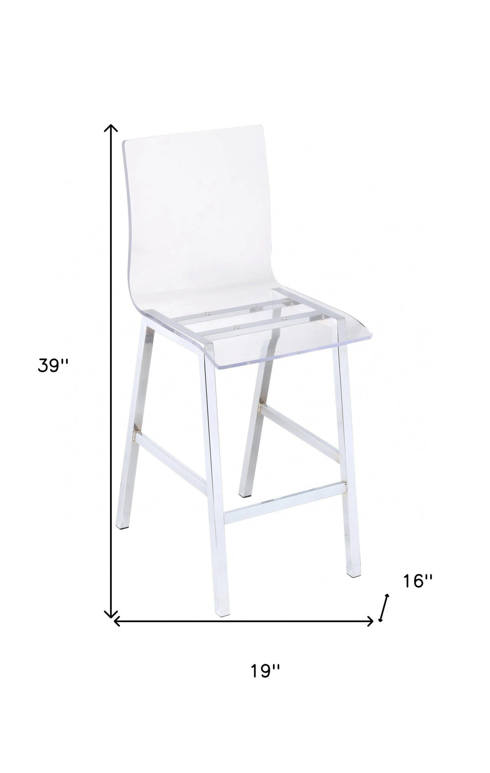 Bring a trendy bar vibe to your space, with this 39-inch clear and silver acrylic and metal counter height bar chair. The clear acrylic seat of this stool is a nice contrast to the high quality, silver metal of the base. The square shape of the seat combines with a full back to give this chair a comfortable and fashionable look. Designed with a footrest for comfort and convenience. 39-inch H x 19-inch W x 16-inch D