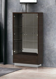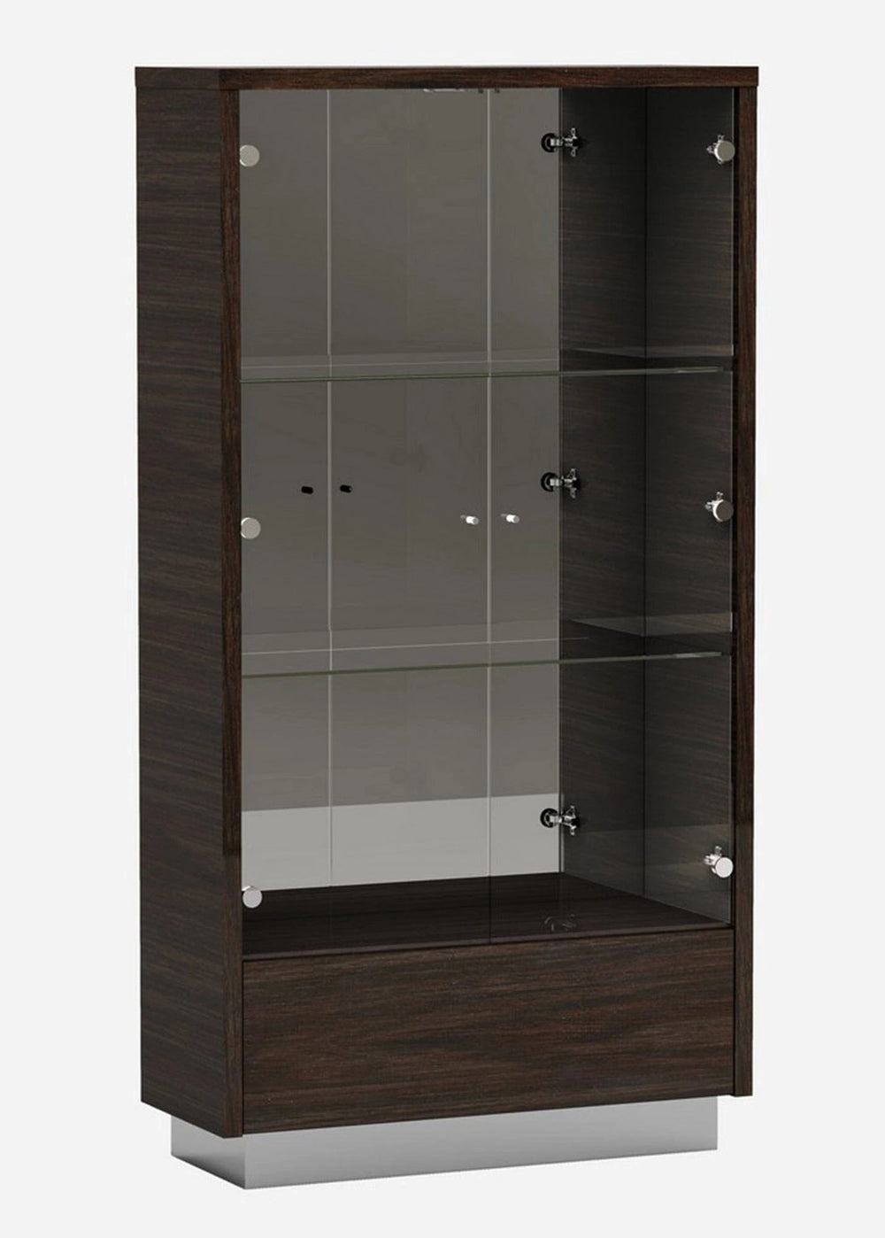 Add a fashionable storage option to your space with this 43-inch silver and dark brown display stand with three shelves and one drawer. Equipped with a single easy open drawer and storage cabinet for practical and good looking storage. Glass doors give this cabinet a luminous and unique designer touch. Its a high quality piece, made from premium grade manufactured wood. Storage vessels don't have to be unsightly. Increase your storage space and the fashion quotient of your room with this hard wearing, versatile, and good looking cabinet. 76-inch H x 43-inch W x 16-inch D