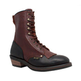 This 8 inch black/dark cherry color full grain tumble leather is a popular packer style boot for ladies. It has solid brass hooks and eyelets that resist breakage and resist corrosion. It also features goodyear welt construction and PU orthotic removable cushion insole.