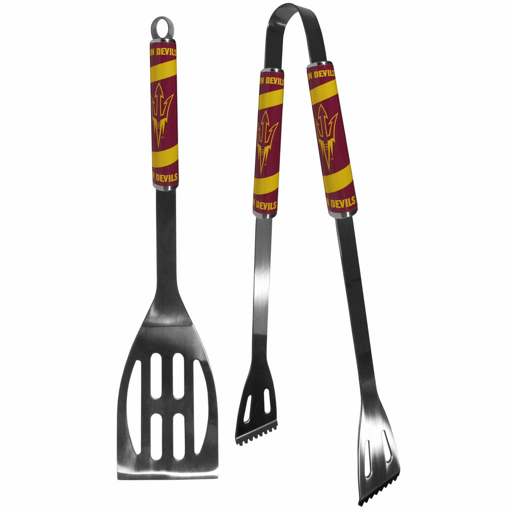 This stainless steel 2 pc BBQ grill set is a tailgater's best friend. The colorful and large team graphics on each of the barbecue tools let's everyone know you are a fan! The set in includes a spatula and tongs with the Arizona St. Sun Devils proudly display on each tool. Whether you are grilling on your patio or tailgating with your friends this set is a party favorite. The 14 inch length makes these tools easy to pack for camping, travel to the big game or any outdoor event Officially licensed College product 2 pc stainless steel grill tool set perfect for tailgate and outdoor parties or at your campsite Colorful and large team graphics are a real hit with the fans making this a great gift idea, what Dad wouldn't want this for Father's Day or Christmas These do not just look good the steel set is high quality and the tongs feature deep ridges for better grip while grilling Look no further for the right present for a Arizona St. Sun Devils fan, satisfaction guaranteed