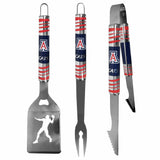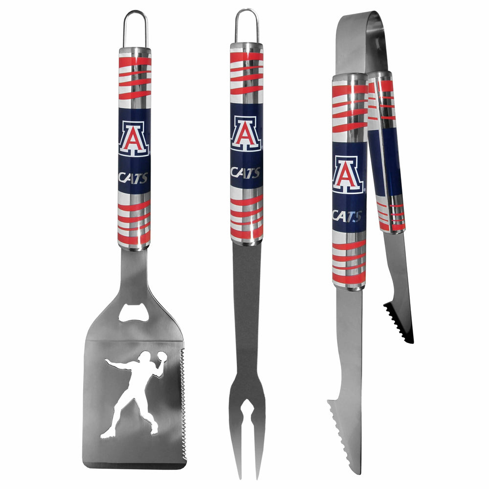 Our tailgater BBQ set really catches your eye with flashy chrome accents and vivid Arizona Wildcats digital graphics. The 430 grade stainless steel tools are tough, heavy-duty tools that will last through years of tailgating fun. The set includes a spatula with a bottle opener and sharp serated egde, fork and tongs.