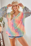 Make a statement with this V-neck tie-dye French terry top featuring a touch of shimmer for added flair. The V-neckline adds a flattering touch to the design while the tie-dye pattern brings a trendy and eye-catching element. The French terry fabric ensures a comfortable and cozy feel, perfect for casual days or a relaxed look. The shiny detail enhances the overall style, making this top a versatile and stand-out piece in your wardrobe. Elevate your casual outfits with this unique and on-trend top.