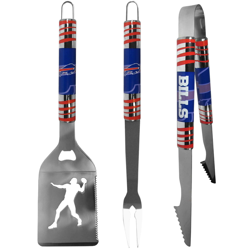 Our tailgater BBQ set really catches your eye with flashy chrome accents and vivid Buffalo Bills digital graphics. The 430 grade stainless steel tools are tough, heavy-duty tools that will last through years of tailgating fun. The set includes a spatula with a bottle opener and sharp serated egde, fork and tongs.