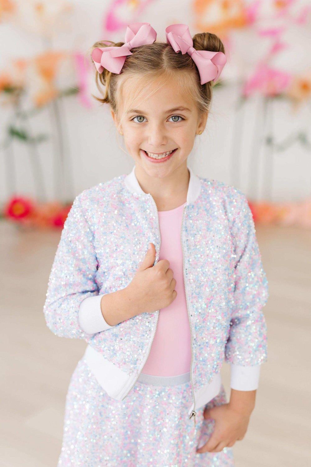 A dazzling piece that will make your little one shine like a star! Perfect for both special occasions and everyday wear. Whether she is twirling, posing for photos, or simply embracing her inner fashionista, this sequin jacket is sure to make a statement. Let her sparkle and shine with confidence and style! Also available in a matching Twirl Skort.