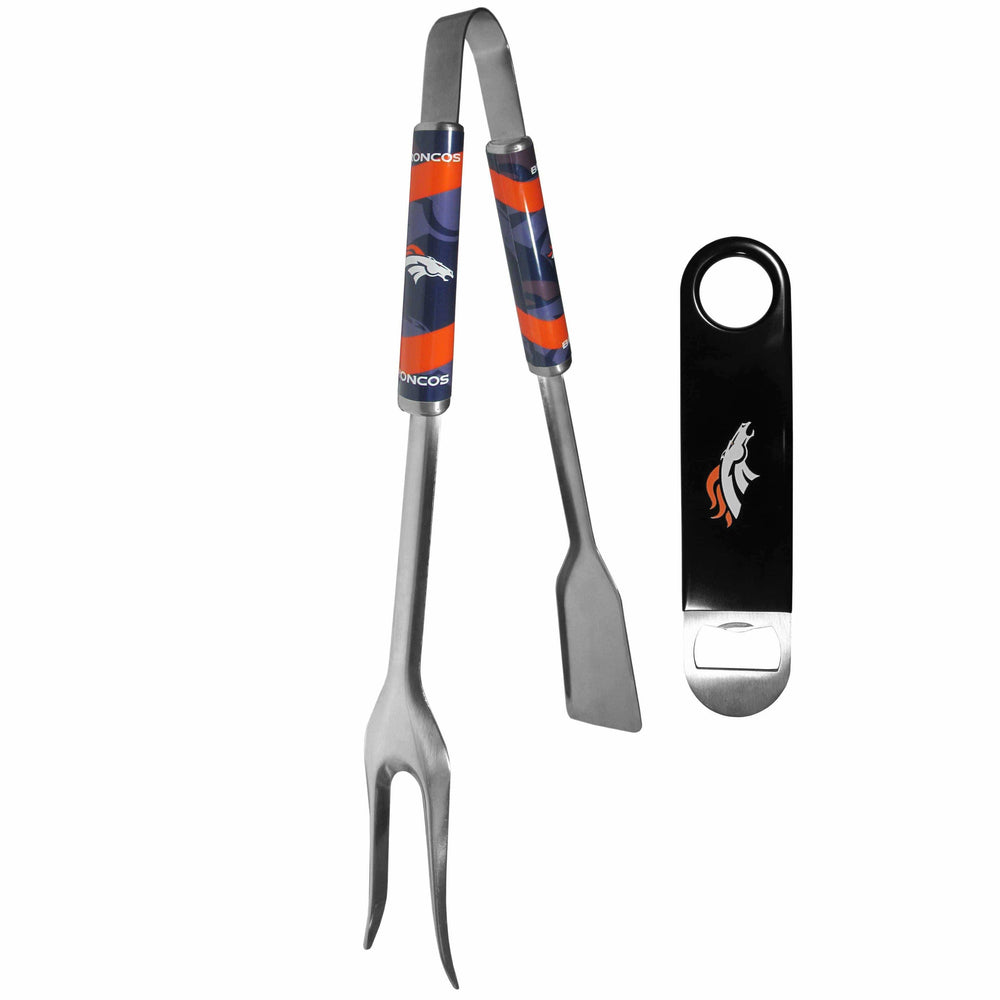The perfect space saving tool! This stainless steel grilling tool is a spatula, tongs and fork all in one high-quality BBQ tool. The tool features bright Denver Broncos graphics. Comes with a heavy-duty steel opener that is extra long, with a durable vinyl covering. The extra length provides more leverage for speed opening and the opener features a large printed team logo. Officially licensed NFL product Licensee: Siskiyou Buckle Tool is 420 grade stainless steel Spatula, tongs and fork all in 1 tool! Comes with extra long steel speed opener Any Denver Broncos fan would be proud to have this set