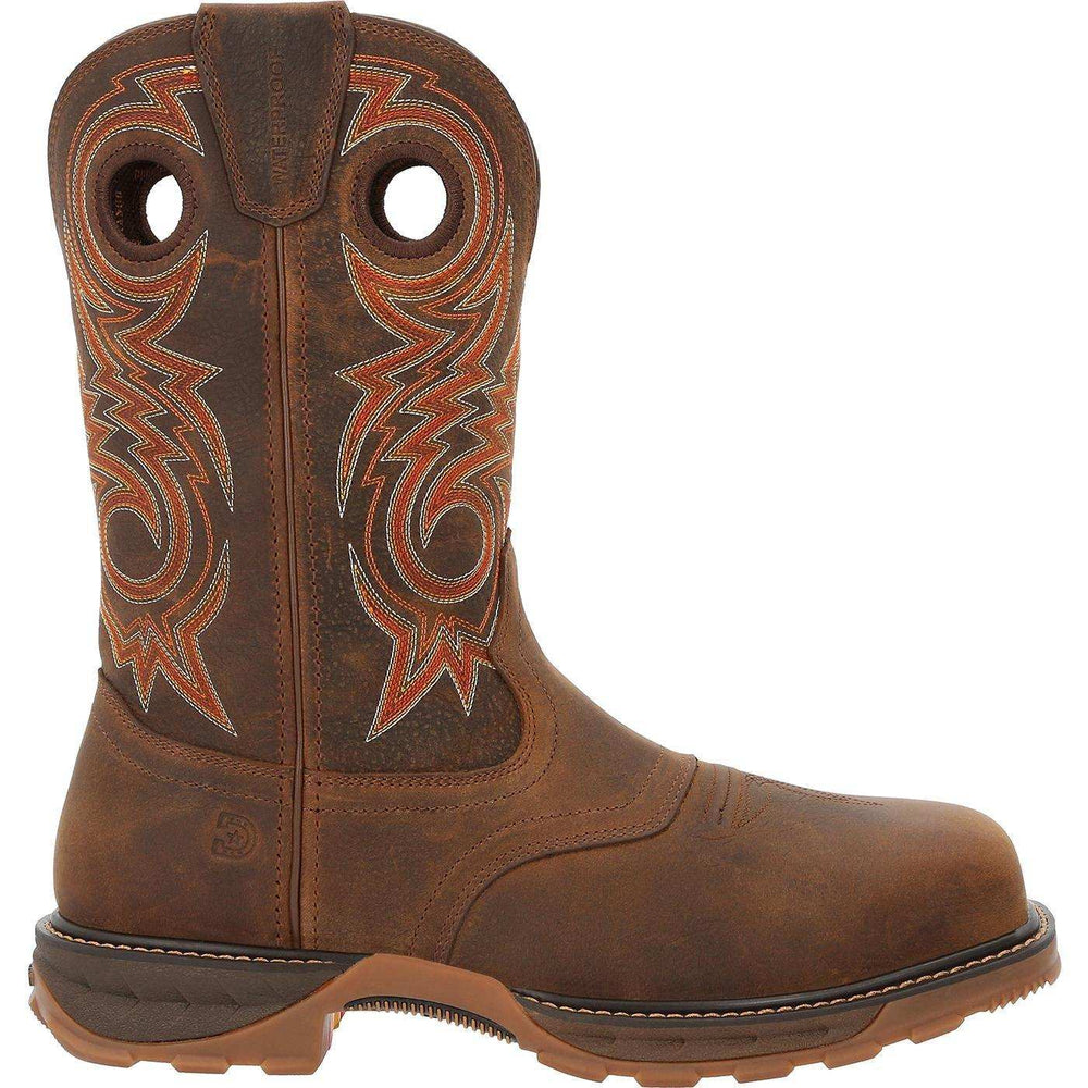 This is the men's 11" Western Waterproof Burly Brown Composite Toe Durango Maverick XP™. This style features full-grain leather, a soft mesh lining, waterproof bootie construction and the Durango X-Pand System™ which is a hidden gore expansion on the inside medial seam for a universal fit and easy on/off. It also has the Durango X-Treme Comfort Footbed™ with memory foam for all day comfort and support and a fiberglass shank for lightweight stability. The midsole is dual-density with a firmer shock absorbing heel for added stability and a soft shock absorbing forepart for ultimate flexibility and comfort. The rolled shank area and anti-torsion rigid external shank provides added lateral stability and the outsole is multi-durometer rubber with high abrasion outer lugs for high impact durability and softer durometer mid lugs for added flexibility and increased slip and oil resistance. It has a single row sole stich around the square toe for added durability and a 1 ½" rocker heel. Break Ground in the men's 11" Western Waterproof Burly Brown Composite Toe Durango Maverick XP™. Get a pair today.