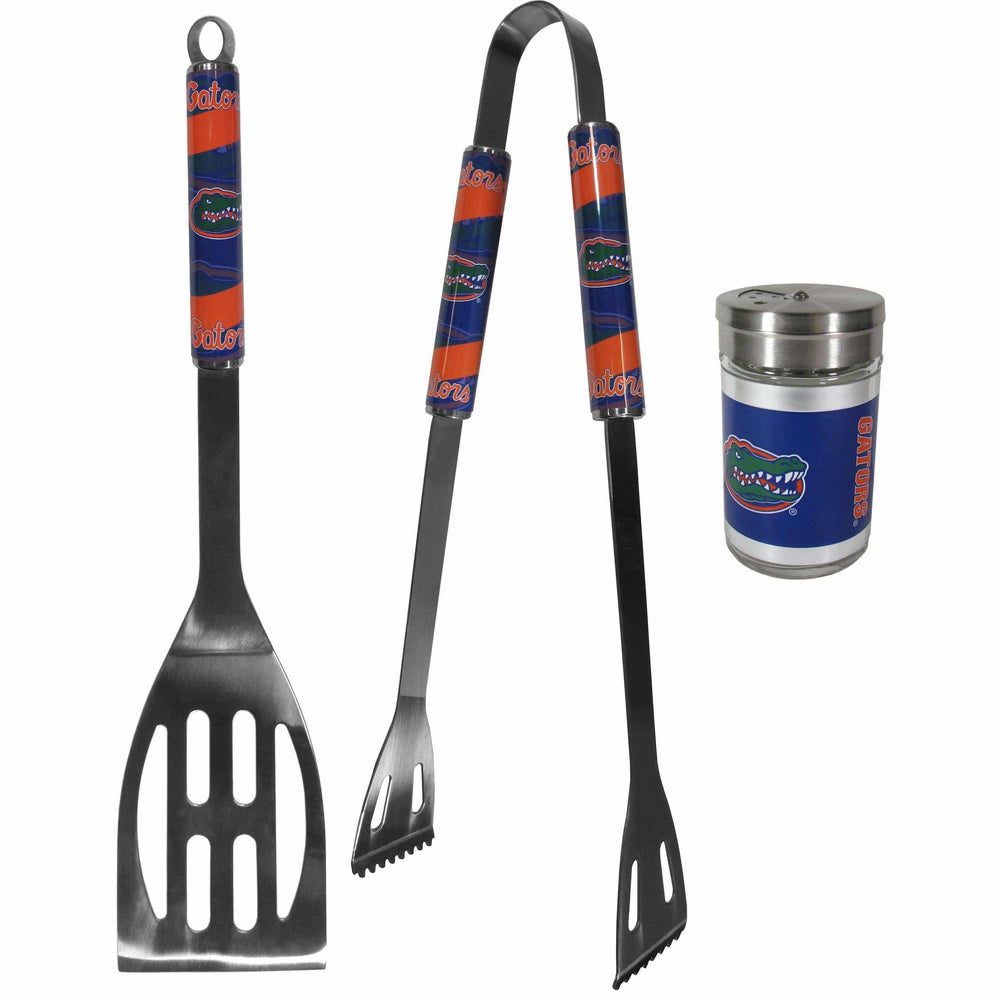This stainless steel 2pc BBQ grill set is a tailgater's best friend. The colorful and large team graphics on each of the barbecue tools let's everyone know you are a fan! The set in includes a spatula and tongs with the Florida Gators logo. The tool set comes with a compact shaker is 2 inch tall with a twist top that closes off the holes at the top making it perfect for travel preventing those messy spills. The shaker has wide holes perfect for keeping your pepper seeds or cheese toppings. Officially licensed College product 2pc stainless steel grill tool set perfect for tailgating and outdoor parties or at your campsite 420 grade stainless steel tools Season shaker twist top that closes off holes so you will not make a mess Tools and shaker feature bright Florida Gators graphics