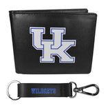 Sports fans do not have to sacrifice style with this classic bi-fold wallet that sports the Kentucky Wildcats extra large logo. This men's fashion accessory has a leather grain look and expert craftmanship for a quality wallet at a great price. The wallet features inner credit card slots, windowed ID slot and a large billfold pocket. Comes with a stylish black strap key chain with clip to easily attach to belts, backpacks or purses.