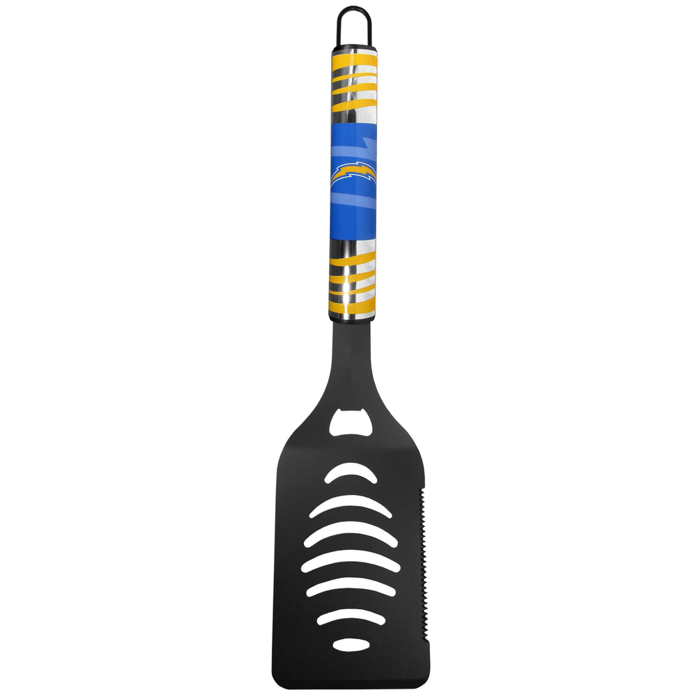 Our tailgater spatula really catches your eye with team color and chrome accents and Los Angeles Chargers digital graphics. The 430 grade stainless steel spatula is a tough, heavy-duty tool that will last through years of tailgating fun. The spatula features a bottle opener and sharp serrated edge and comes with a matte black finish.