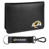 Ditch your bulky wallet! This super slim leather wallet is the perfect weekend companion and sports fan accessory. The compact design features 2 credit card slots on the front and one on the back and an inner middle pocket for cash. The front of the wallet has a crisp silk screened Los Angeles Rams logo expertly printed on the front corner. Comes with a stylish black strap key chain with clip to easily attach to belts, backpacks or purses.