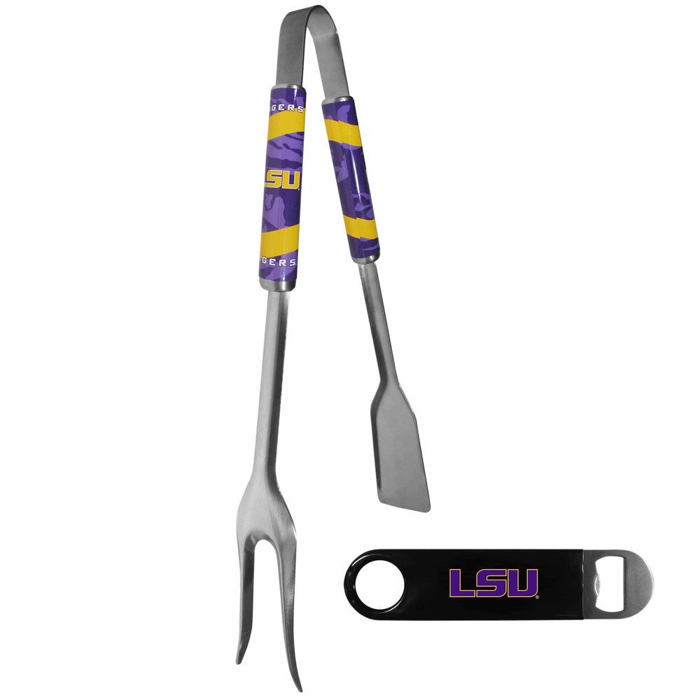 The perfect space saving tool! This stainless steel grilling tool is a spatula, tongs and fork all in one high-quality BBQ tool. The tool features bright LSU Tigers graphics. Comes with a heavy-duty steel opener that is extra long, with a durable vinyl covering. The extra length provides more leverage for speed opening and the opener features a large printed team logo. Officially licensed College product Licensee: Siskiyou Buckle Tool is 420 grade stainless steel Spatula, tongs and fork all in 1 tool! Comes with extra long steel speed opener Any LSU Tigers fan would be proud to have this set