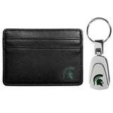 Ditch your bulky wallet! This super slim leather wallet is the perfect weekend companion and sports fan accessory. The compact design features 2 credit card slots on the front and one on the back and an inner middle pocket for cash. The front of the wallet has a crisp silk screened Michigan St. Spartans team logo. This front pocket wallet is just slightly larger than a credit card and super slim but with the inner pocket and outer slots it still can hold everything that you need. Comes with a stylish steel teardrop key chain that features the team logo printed on the front and a high polish chrome finish on the back.