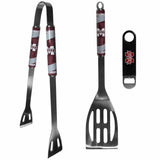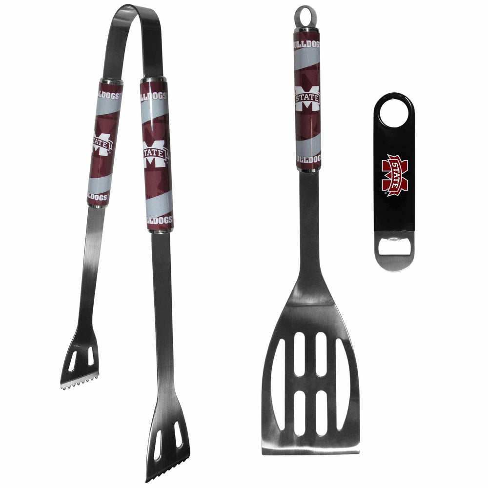 This stainless steel 2 pc BBQ grill set is a tailgater's best friend. The colorful and large team graphics on each of the barbecue tools let's everyone know you are a fan! The set in includes a spatula and tongs with the Mississippi St. Bulldogs proudly display on each tool. Whether you are grilling on your patio or tailgating with your friends this set is a party favorite. The 14 inch length makes these tools easy to pack for camping, travel to the big game or any outdoor event. Comes with a heavy-duty steel opener that is extra long, with a durable vinyl covering. The extra length provides more leverage for speed opening and the opener features a large printed team logo. Officially licensed College product Licensee: Siskiyou Buckle 2 pc stainless steel grill tool set perfect for tailgate and outdoor parties or at your campsite These do not just look good the steel set is high quality and the tongs feature deep ridges for better grip while grilling Comes with extra long steel speed opener Any Mississippi St. Bulldogs fan would be proud to have this set