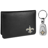 This unique mini wallet has all the benefits of a weekend wallet with the added security of a traditional bi-fold. Unlike other weekend wallets that can become stretched and allow your credit cards to slip free this wallet flips over to close and make sure your cash and cards remove safely inside the wallet. The classic black wallet features a New Orleans Saints logo expertly printed on the front corner. Comes with a stylish steel teardrop key chain that features the team logo printed on the front and a high polish chrome finish on the back.