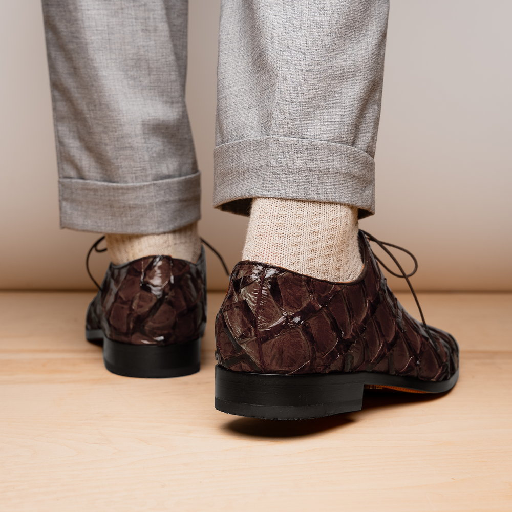 The Olivieri collection is our daring interpretation of the classic dress oxford, masterfully handcrafted using genuine pirarucu skin—a rare Amazonian fish prized for its bold texture and dramatic scale patterns. This collection elevates formal footwear with exotic flair and contemporary detail, making it a staple for discerning gentlemen who appreciate distinctive luxury.