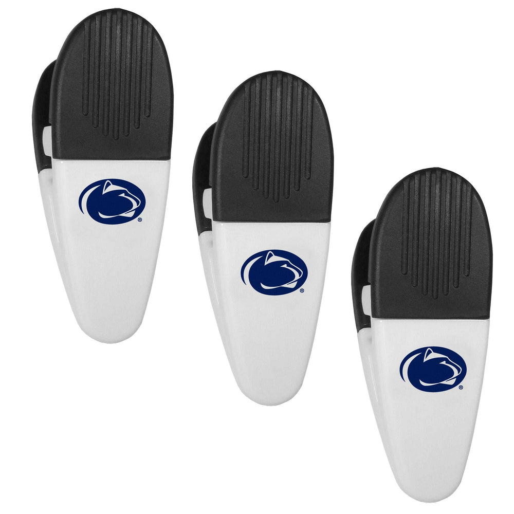 Our Penn St. Nittany Lions chip clip magnets feature a crisp team logo on the front of the clip. The clip is perfect for sealing chips for freshness and with the powerful magnet on the back it can be used to attach notes to the fridge or hanging your child's artwork. Set of 3 magnet clips, each clip is 3.5 inches tall and 1.25 inch wide.