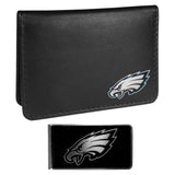 This unique mini wallet has all the benefits of a weekend wallet with the added security of a traditional bi-fold. Unlike other weekend wallets that can become stretched and allow your credit cards to slip free this wallet flips over to close and make sure your cash and cards remove safely inside the wallet. The classic black wallet features a Philadelphia Eagles logo expertly printed on the front corner. Comes with separate steel money clip with a classic black & metal finish.