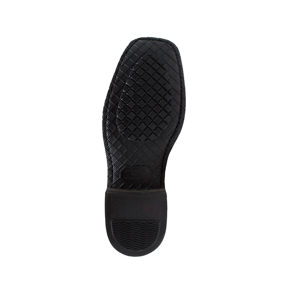 This 12in black heavy duty full grain oiled leather upper harness boot features rubber oil-resistant sole and heel, a square soft toe and cushion insole. It also has o-ring ankle harness strap with goodyear construction for security and durability.
