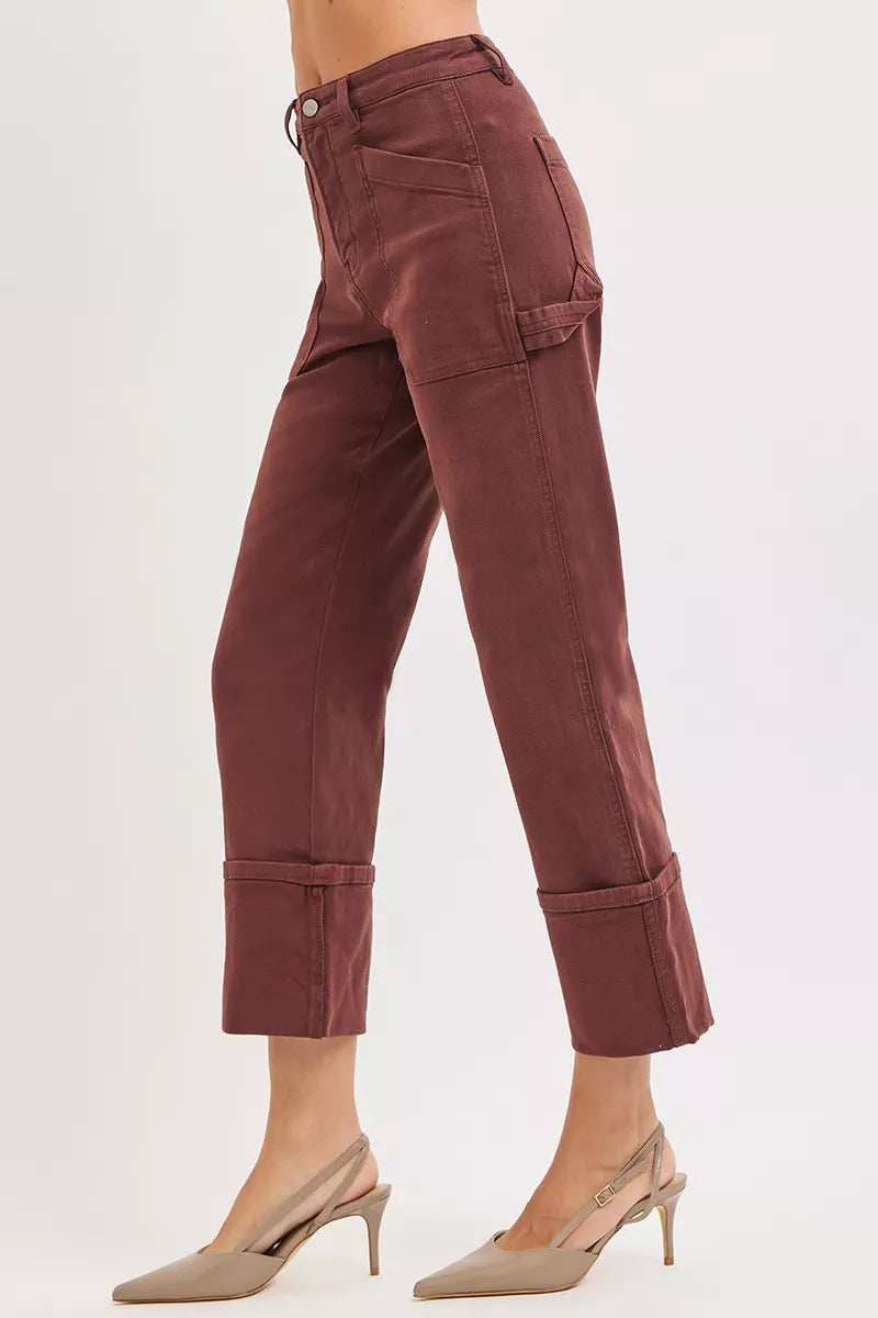 These premium high-waisted carpenter jeans feature a striking burgundy wine color that sets them apart from traditional denim. Crafted from durable cotton denim with excellent shape retention, they offer a relaxed wide-leg silhouette that's both comfortable and on-trend. The high-waisted design creates a flattering fit while the cuffed hem adds contemporary styling. Functional carpenter details include utility pockets and classic five-pocket construction. The rich burgundy hue makes these jeans perfect for creating standout casual looks while maintaining the versatility to dress up or down. Quality construction ensures long-lasting wear and the cropped length pairs perfectly with various footwear options.