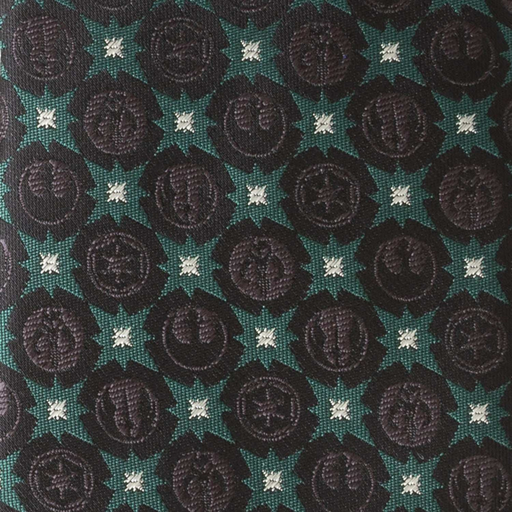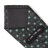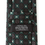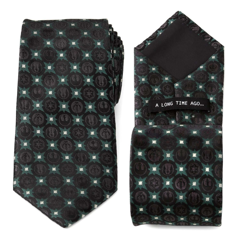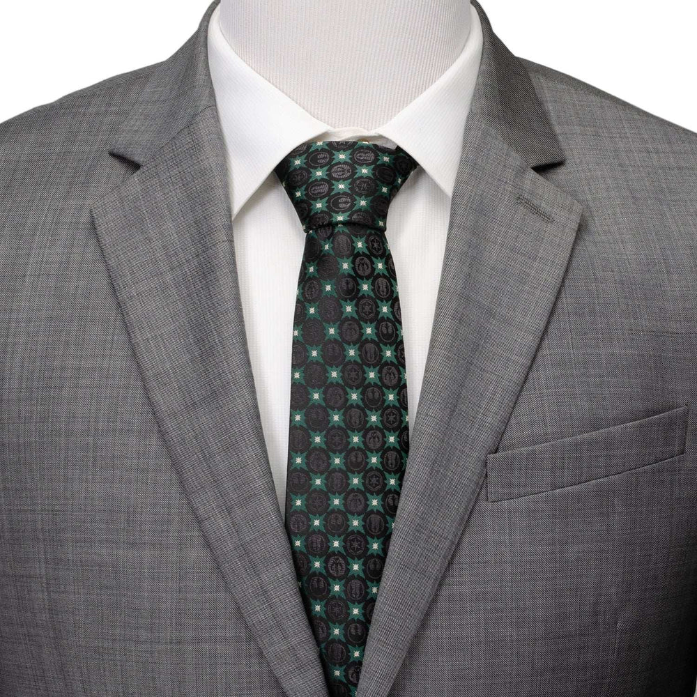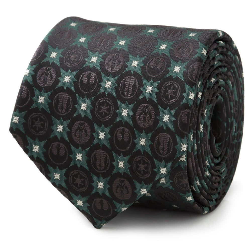 Featuring sigil motifs from the Empire, Jedi, Rebel Alliance, and Mandalorians, our Star Wars Symbols Black Tie is a must have for the diehard Star Wars fan. Black symbols blend together seamlessly with forest green stars and accents of silver. It's a tie that represents some of the most prominent entities in the Star Wars universe. Our tie will maintain its shape and hold a sturdy knot thanks to the durable yet stylish 100% Polyester. Officially licensed by LucasFilm LTD.