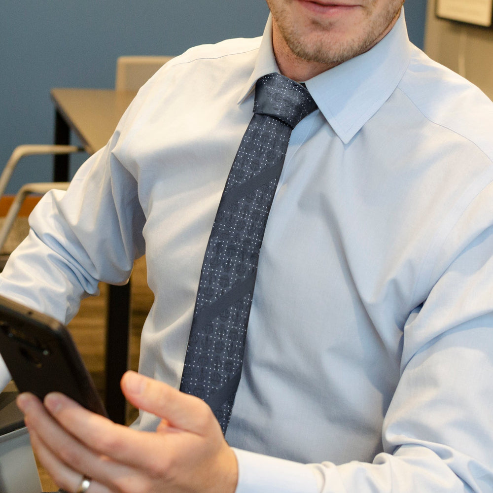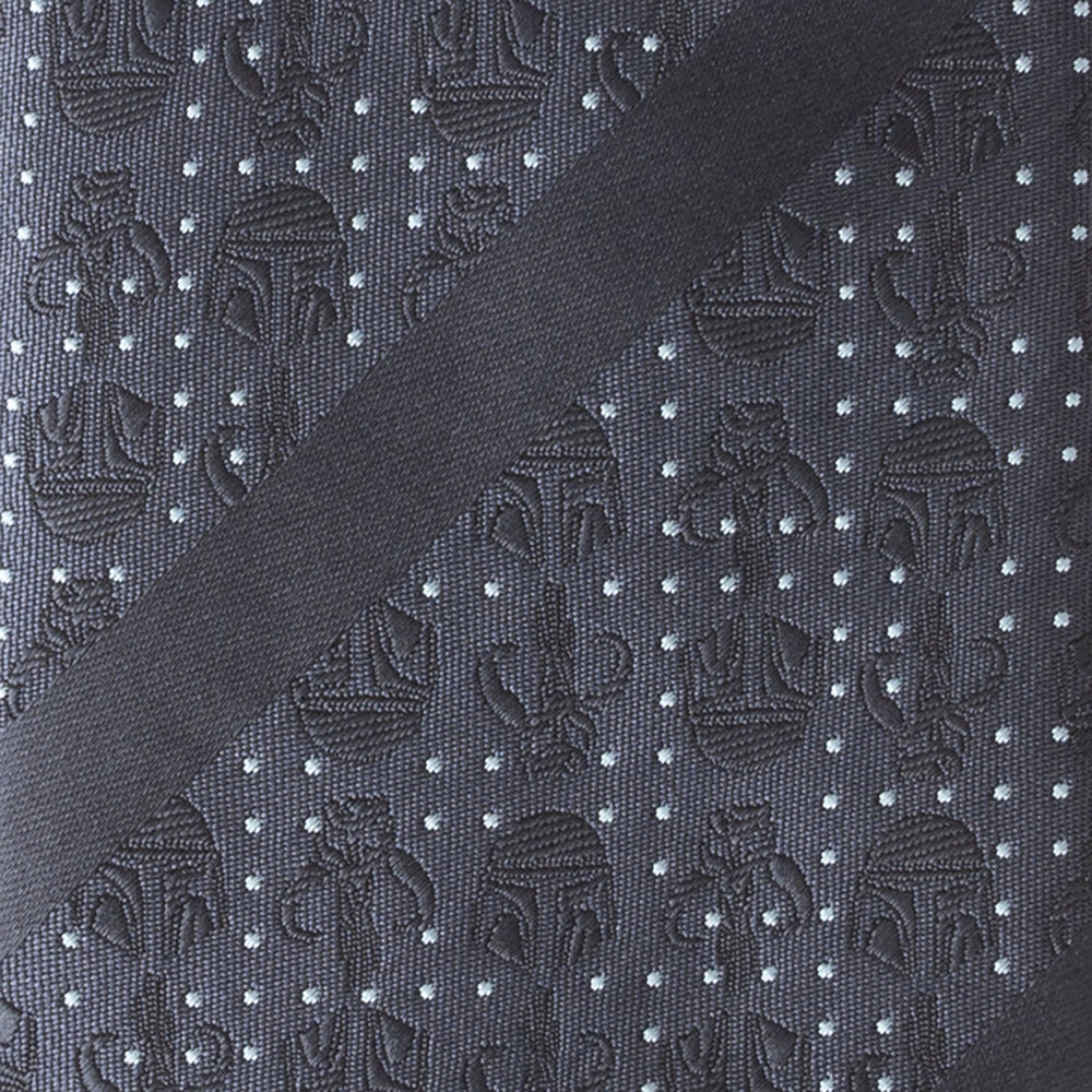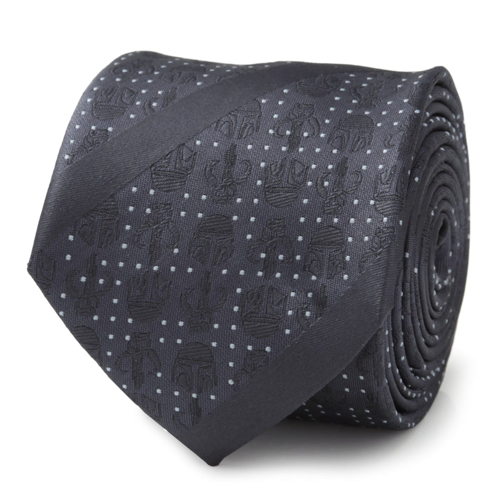 "I'm a Mandalorian. Weapons are part of my religion." Take on your personal Mythosaur with the weapons at your disposal. This prussian blue tie hides a pattern of Mandalorian helmets and Mythosaur skulls among powder blue dots that draw the eye. Our tie will maintain its shape and hold a sturdy knot thanks to the durable yet stylish 100% Polyester. Pairs well with any of our Mandalorian items for a finished look. Officially licensed by LucasFilm LTD.