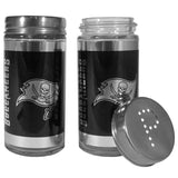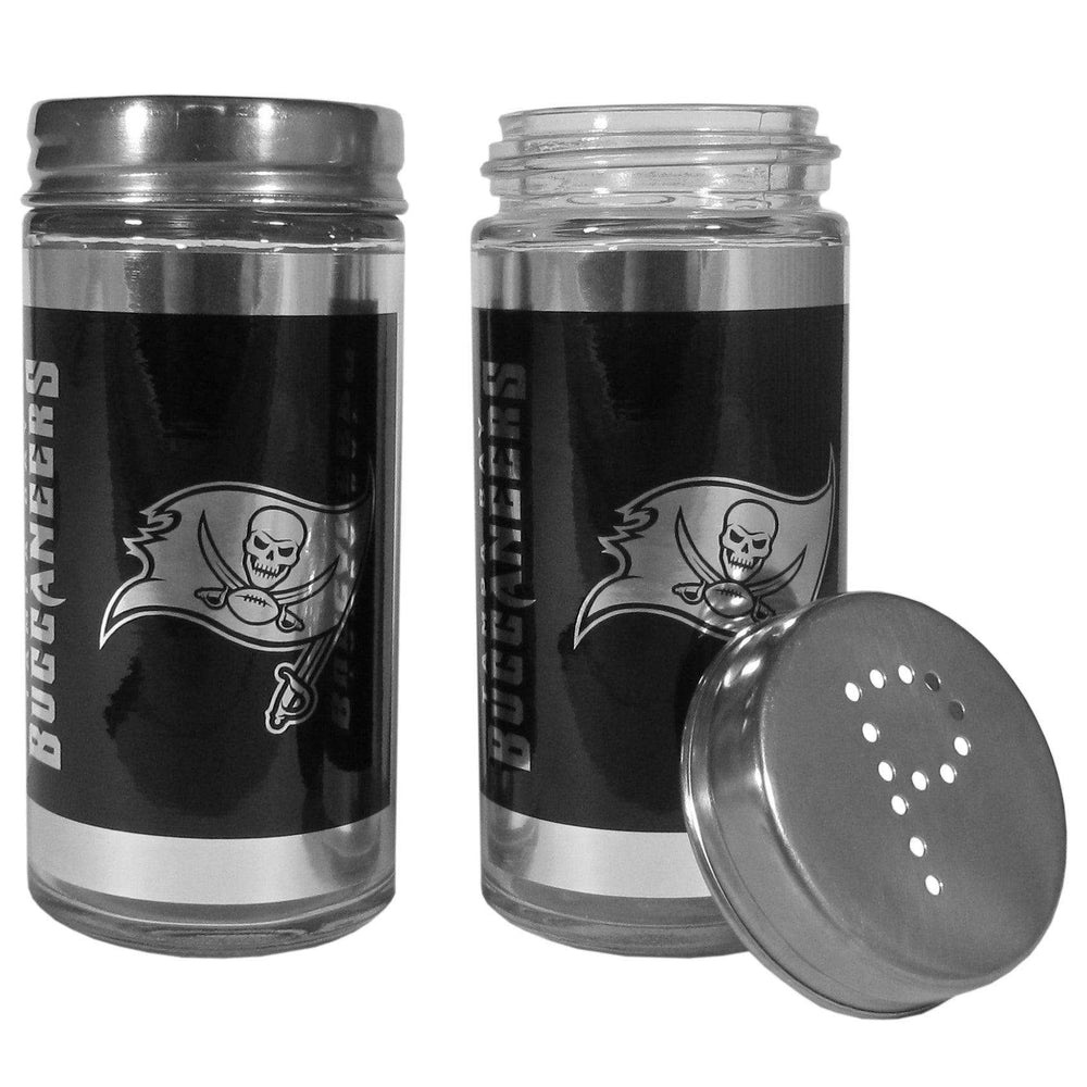 No tailgate party is complete without your Tampa Bay Buccaneers salt & pepper shakers featuring black and chrome team graphics. The glass shakers are 3.75 inches tall and the screw top lids have holes that spell out P and S. These team shakers are a great grill accessory whether you are barbecuing on the patio, picnicing or having a game day party.
