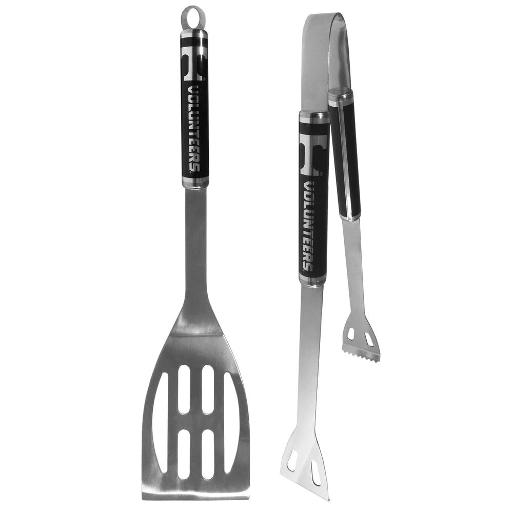 This stainless steel 2 pc BBQ set is a tailgater's best friend. The black and chrome team graphics let's everyone know you are a fan! The set in includes a spatula and tongs with the Tennessee Volunteers proudly display on each tool.