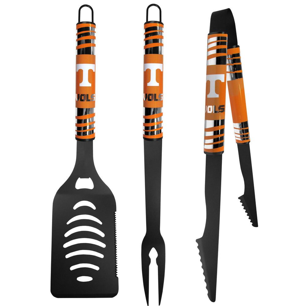 The eye-catching team color and chrome graphics on this set make it a game day favorite! The high-quality, 3 pc Tennessee Volunteers BBQ grill set will make any grill master smile. These barbeque tools are made to last whether you are using them for camping, tailgating or a patio party you will have quality grill tools for years to come. The set includes a large spatula with a bottle opener feature and sharp serrated edge, strong tongs and fork all in a matte black finish. The 17 inch length keeps you far from the flames. The quality of the tools make them a great choice for Father's Day or Christmas gifts, they are really a grill accessory must have.