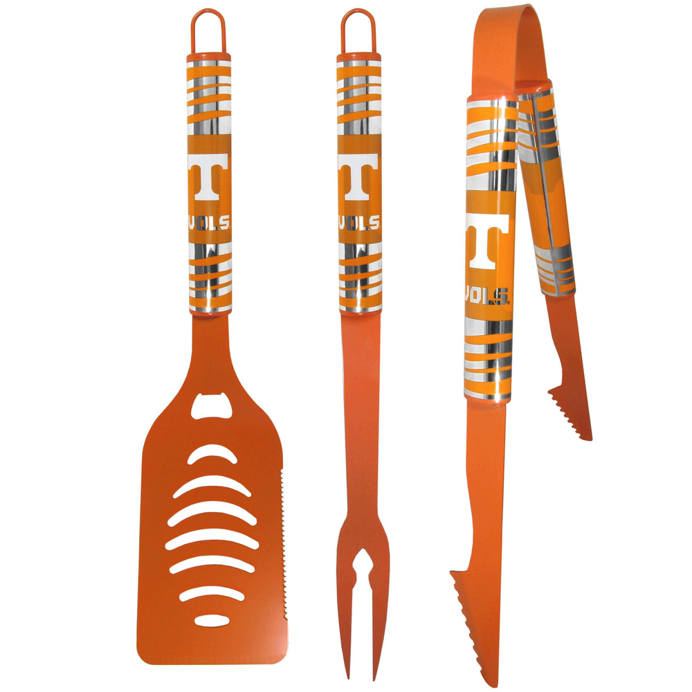 The eye-catching black and chrome graphics on this set make it a game day favorite! The high-quality, 3 pc Tennessee Volunteers BBQ grill set will make any grill master smile. These barbeque tools are made to last whether you are using them for camping, tailgating or a patio party you will have quality grill tools for years to come. The set includes a large spatula with a bottle opener feature and sharp serrated edge, strong tongs and fork all in a team color finish. The 17 inch length keeps you far from the flames. The quality of the tools make them a great choice for Father's Day or Christmas gifts, they are really a grill accessory must have.