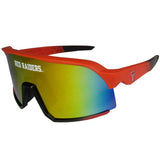The sunglasses have a wraparound design intended to fit the lens as close to the face as possible, covering your eye and providing a wider field of view, frame retention and impact protection. The mirrored lens provides protection against glare and has the maximum UVA/UVB protection. The stylish shades feature the team name across the lens and the Texas Tech Raiders logo on the arms.