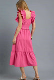 This stunning pink midi dress features eye-catching ruffle shoulder straps and a flattering smocked waist that accentuates your silhouette. Made from lightweight, breathable fabric perfect for warm weather styling. The romantic ruffle details and tiered hem create a feminine, flowy appearance while the elastic waistband ensures comfortable all-day wear. The vibrant pink hue makes it perfect for spring and summer occasions, from brunch dates to garden parties. The midi length offers modest coverage while maintaining a fashion, contemporary look.
