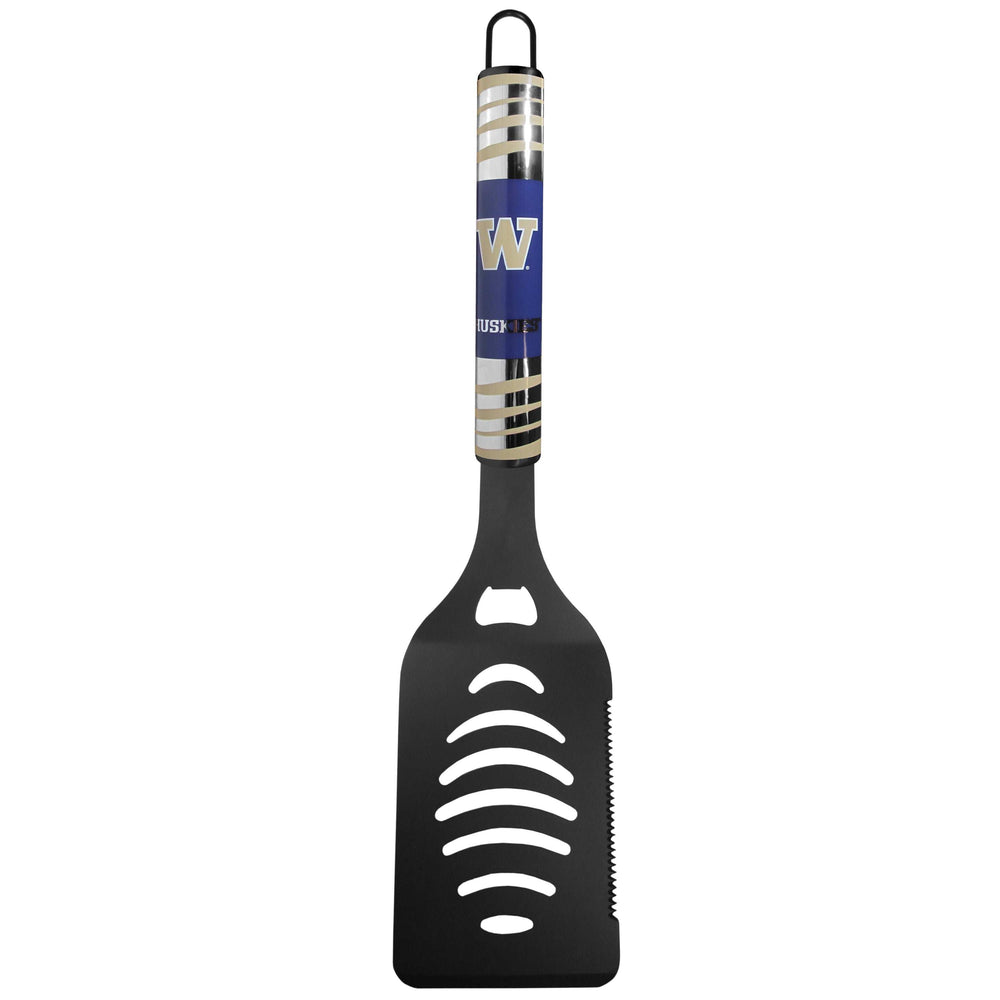 Our tailgater spatula really catches your eye with team color and chrome accents and Washington Huskies digital graphics. The 430 grade stainless steel spatula is a tough, heavy-duty tool that will last through years of tailgating fun. The spatula features a bottle opener and sharp serrated edge and comes with a matte black finish.