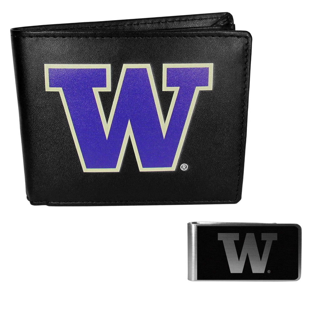Our classic fine leather bi-fold wallet is meticulously crafted with genuine leather that will age beautifully so you will have a quality wallet for years to come. The wallet opens to a large, billfold pocket and numerous credit card slots and has a convenient windowed ID slot. The front of the wallet features an extra large Washington Huskies printed logo. Comes with separate steel money clip with a classic black & metal finish.