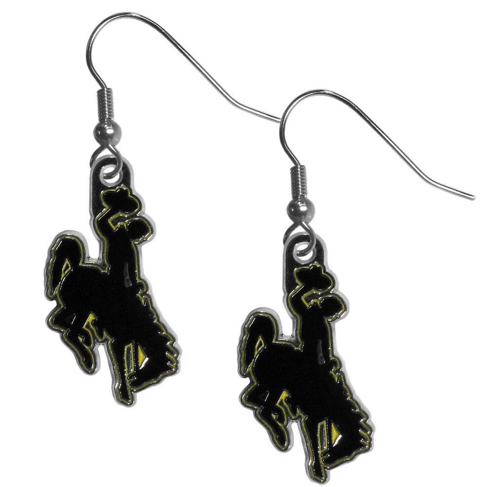 Our officially licensed chrome dangle earrings have fully cast Wyoming Cowboy charms with exceptional detail and a hand enameled finish. The earrings have a high polish nickel free chrome finish and hypoallergenic fishhook posts.